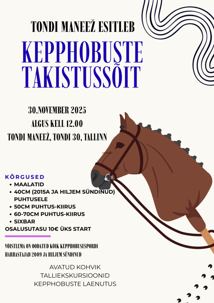 Olete oodatud kepphobustevõistlusele Tondi Maneeži. Kavas on takistussõit viiel erineval kõrgusel. Kõige väiksemad saavad alustada maalattidest ja päeva tipphetkeks on GP kõrgusel 80-90cm.